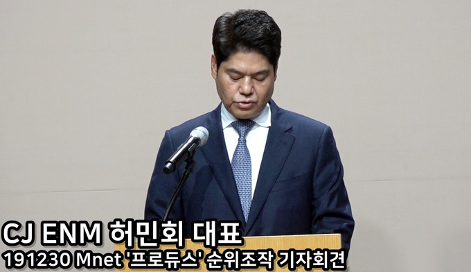 CJ ENM 허민회 대표가 30일 오후 서울 마포구 상암동에 위치한 CJ ENM에서 Mnet 오디션 프로그램 '프로듀스' 순위조작 관련 기자회견에 참석하여 취재진들 앞에서 사과문을 발표하고 있다.