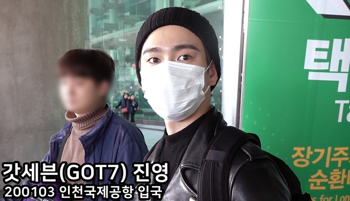 3일 오후 인천광역시 중구에 위치한 인천국제공항 제1터미널에서 그룹 갓세븐(GOT7)의 진영이 해외 일정을 마치고 입국하고 있다.