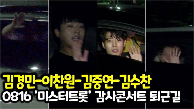 [뉴스인스타 양철수기자] 8월 16일 오후 서울시 송파구 방이동 올림픽공원 KSPO DOME에서 열린 '내일은 미스터트롯' 대국민 감사콘서트 서울 공연에서 2주차 마지막 공연을 마치고 미스터트롯 임영웅, 영탁, 이찬원, 장민호, 김희재와 김수찬, 김중연, 김경민이 퇴근하고 있다.