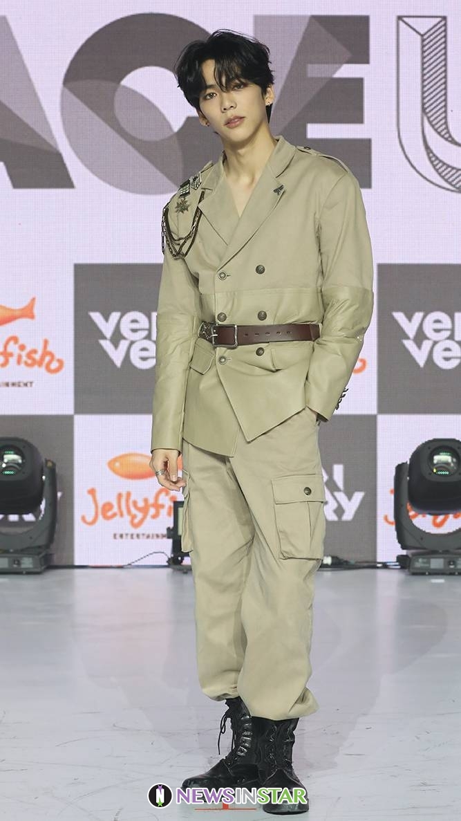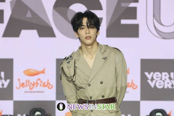[뉴스인스타 양철수기자] 10월 13일(화) 오후 그룹 베리베리(VERIVERY) 동헌, 호영, 민찬, 계현, 연호, 용승, 강민의 다섯번째 미니앨범 ‘FACE US’ 발매 기념 미디어 온라인 쇼케이스가 열려 포토타임에 민찬이 포즈를 취하고 있다.