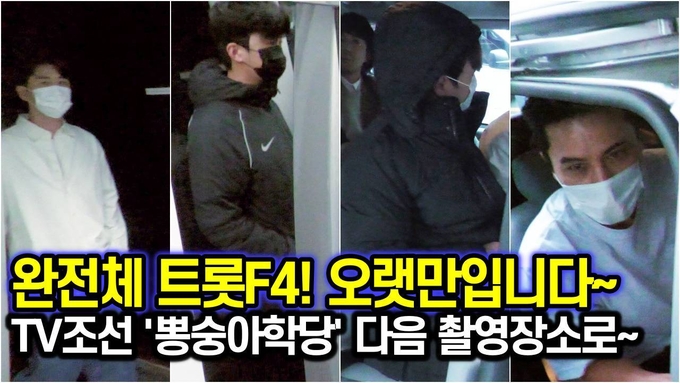 [뉴스인스타 양철수기자] 11월 17일(화) 오후, 서울시 강남구 논현동 이경제한의원에서 진행되는 `뽕숭아학당` 녹화를 마치고 미스터트롯 임영웅, 영탁, 이찬원, 장민호와 MC 붐쌤이 다음 촬영 장소로 이동하기 위해 나서고 있다.