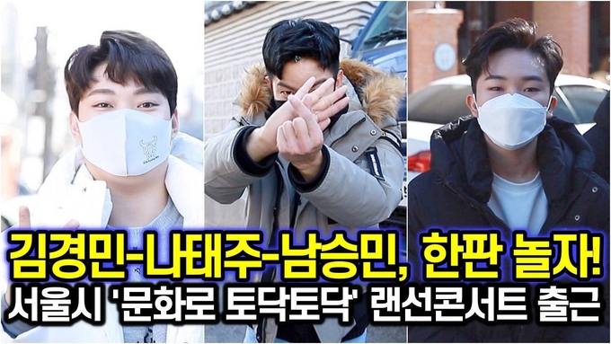 [뉴스인스타 양철수기자] 12월 19일(토) 서울시 종로구 와룡동 서울돈화문국악당에서 진행되는 '문화로 토닥토닥' 랜선콘서트에 출연하기 위해 미스터트롯 남승민-김경민-나태주가 출근하고 있다.