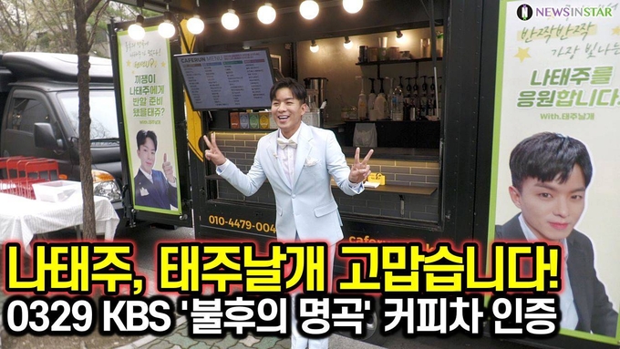 [뉴스인스타 양철수기자] 3월 29일(월) 오후, 서울시 영등포구 여의도 KBS 공개홀에서 진행되는 KBS ‘불후의 명곡’ 녹화에 '미스터트롯' 나태주 팬이 선물한 커피차와 간식차에서 인증 사진을 촬영하고 있다.