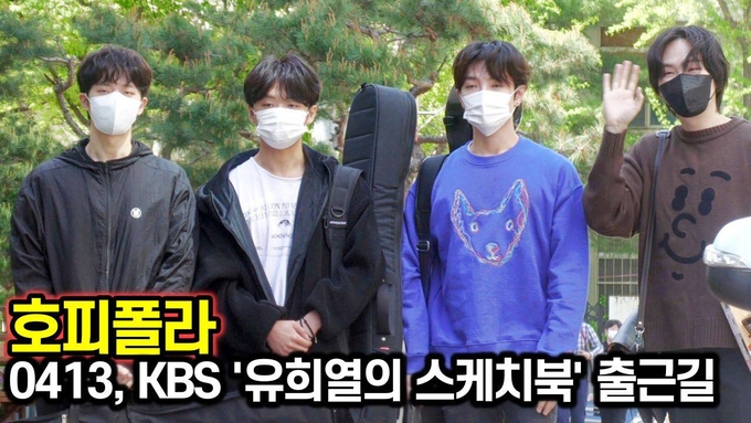 [뉴스인스타 양철수기자] 4월 13일(화) 오후, 서울시 영등포구 여의도 KBS에서 진행되는 ‘유희열의 스케치북’ 녹화를 위해 그룹 '호피폴라' 아일, 홍진호, 하현상, 김영소가 방송국에 도착하고 있다.