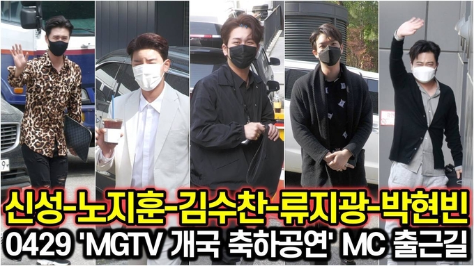 [뉴스인스타 양철수기자] 4월 29일 서울의 한 공연장에서 진행되는 MGTV 개국을 축하하는 '개국 축하쇼'에 트롯 가수 신성, 노지훈, 김수찬, 박현빈, 류지광이 출근하고 있다.