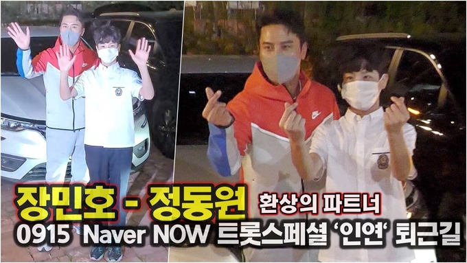 [뉴스인스타 양철수기자] 9월 15일(수) 오후, 서울시 마포구 한 스튜디오에서 진행된 Naver NOW 트롯 스페셜 '인연' 녹화를 마치고 미스터트롯 정동원 장민호가 스튜디오를 나서며 팬들에게 인사를 하고 있다.