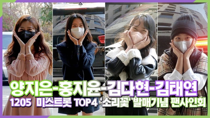 [뉴스인스타 양철수기자] 12월 5일(일) 오후, 서울시 양천구 목동 한국방송회관 코바코홀에서 진행되는 미스트롯 TOP4 '소리꽃' 발매기념 팬사인회에 참석하기 위해 양지은-홍지윤-김다현-김태연이 도착해 포즈를 취하고 있다.