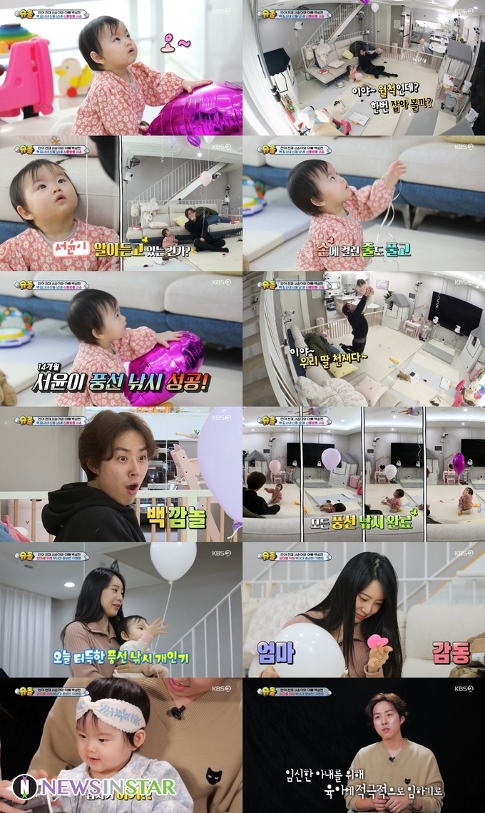 아빠의 말을 알아듣고, 행동까지 완벽하게 카피한 서윤이의 천재성이 백성현은 물론 내레이션을 하는 소유진과 육중완까지 감탄하게 했다. 이에 더해 서윤이는 잡아당기다가 손에 걸린 줄도 스스로 풀고, 나중에는 아빠의 시범 없이 혼자서도 풍선 낚시에 성공했다. 백성현은 그런 서윤이를 보며 "내가 천재를 낳았어"라며 놀라워했다.