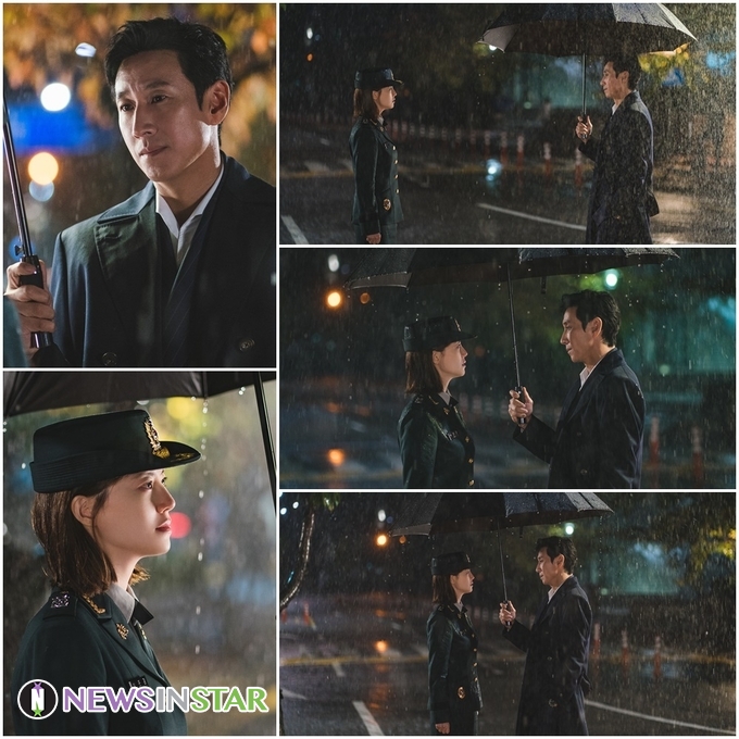 이와 관련 이선균과 문채원이 비 내리는 밤, 검은 우산 아래 서로를 마주한 그림같은 투샷이 공개됐다. 검은 트렌치코트를 입은 은용(이선균)이 제복 차림을 한 채 장대비를 고스란히 맞고 있는 박준경(문채원)에게 다가가는 장면. 은용은 박준경에게 커다란 우산을 받쳐 차가운 비를 막아준 후 따뜻한 눈빛을 건넨다. 박준경 역시 그런 은용을 말없이 바라보며 고마움과 뭉클함이 한데 섞인 복잡한 감정의 미소를 띄우는 것. 어렵게 다시 만난 두 사람은 과연 어떤 과거사 속에 얽혀있는 것일지, 무려 10년 만에 서로를 마주하게 된 사연은 무엇일지 궁금증을 끌어 올린다.