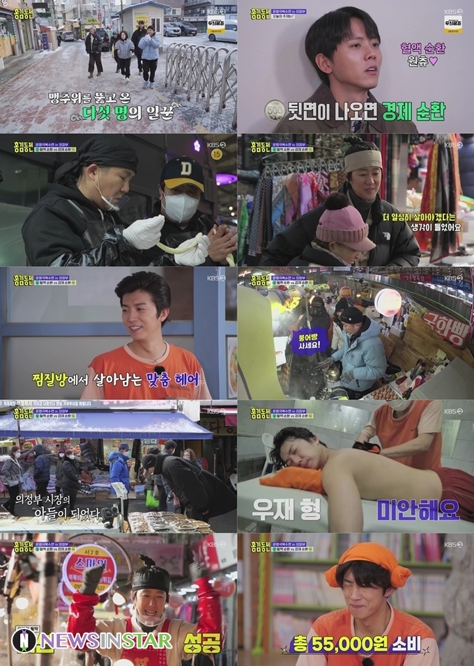 지난 1월 8일 방송된 KBS 2TV 예능 '홍김동전'(연출 박인석 이명섭) 22회는 멤버들이 코로나 이후 침체기를 겪는 지역상권 활성화를 위해 전통시장 일일 알바에 나섰다. 의정부 전통 제일시장을 찾은 멤버들은 동전을 던져 앞면이 나오면 ‘혈액순환’, 뒷면이 나오면 ‘경제순환’으로 앞면은 찜질방 풀 코스를, 뒷면은 의정부 제일시장에서 일일 알바에 참여했다. 매출이 간절한 영하 13도의 강추위 속에 멤버들과 각 사장님들의 특급 케미가 훈훈한 웃음을 자아냈다.