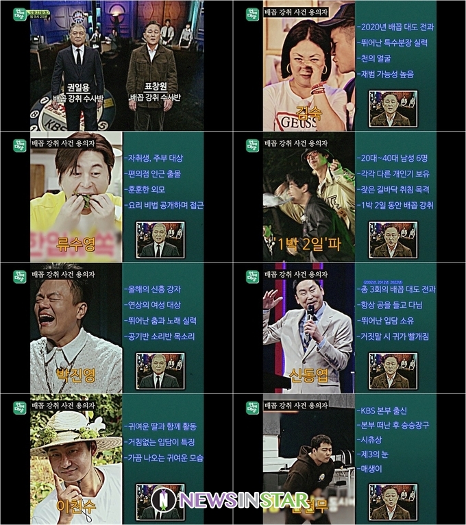 이들이 수배를 내린 첫 번째 후보는 김숙. 표창원은 김숙의 예능 패턴을 분석하며 "각종 분장을 활용해 남녀노소, 시대초월, 국적불문 부캐로 변신해가며 시청자들의 배꼽을 공격하고 있다"라고 주의를 줘 웃음을 자아낸다. '홍김동전', '사장님 귀는 당나귀 귀'를 진행하며 전천후 활약을 펼치고 있는 김숙이 2020년 KBS 연예대상에 이어 여성 최초 대상 2관왕 타이틀을 거머쥘 수 있을지 주목된다.