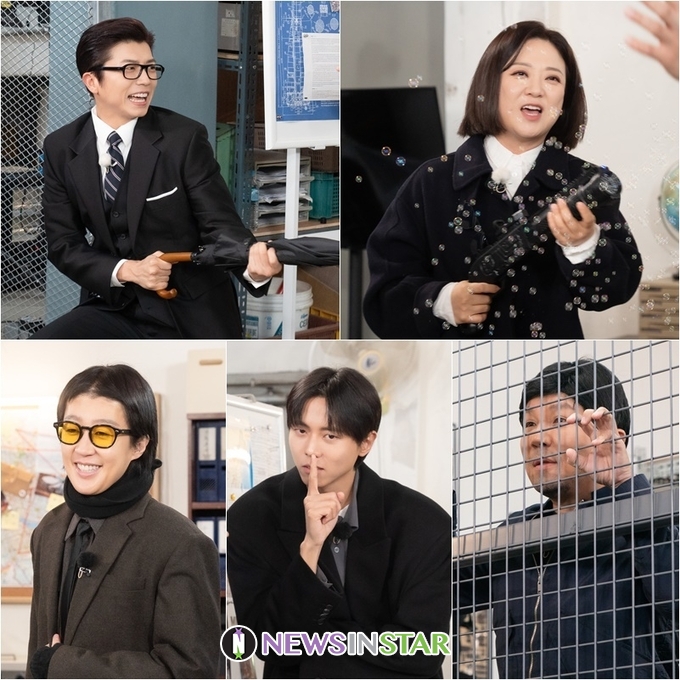드레스 코드 ‘비밀요원’으로 등장한 멤버들은 5인 5색의 변신으로 웃음을 자아낸다. 먼저 홍진경은 “나는 런던 파견된 아시아 지국장이야”라며 여유로운 아우라를 뽐낸다. 블랙으로 차려입은 김숙은 “전 김숙입니다. 하지만 무기가 있죠”라더니 품에서 블랙 총을 꺼내 다다다 쏜다. 총에서 터져 나온 것은 비눗방울. 삽시간에 모두를 비눗방울에 혼을 빼앗긴 어린이로 만들어 김숙은 동심을 주입하는 비밀요원이 된다. 이어 조세호는 “갈비인가 통닭인가”를 읊조리며 영화 ‘극한직업’의 류승룡에 빙의한다. 그러나 우영이 “형은 창살 뒤로 가서 이야기하는 게 어울릴 거 같아요”라고 말해 류승룡에서 한순간에 탈주범으로 신분 하락을 겪는다고. 이어 주우재는 ‘무빙’에서 조인성이 분한 김두식으로 변신한다. 조인성 못지않은 우월 기럭지이지만 곧 하늘로 날아갈 거 같은 허약한 체력이 안쓰러움을 자아낸다. 마지막으로 우영은 젠틀한 ‘킹스맨’에 빙의한다. 우영은 “킹스맨과 제일 비슷한 안경을 특별히 구해왔어요”라고 밝혀 웃음을 자아낸다. 긴 장우산을 한 손으로 자연스럽게 돌리며 활약을 예고한다.