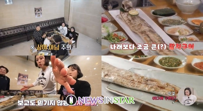 자리에서 일어나 갈치의 위용을 살피던 김숙은 "나래보다 조금 작다"라며 직접 사이즈를 측정한다. 머리부터 꼬리까지 1m가 조금 넘는 제주산 은갈치는 공식 프로필 상 키가 148인 박나래보다 조금 작은 셈.