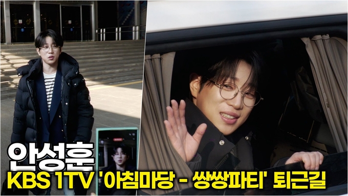 [뉴스인스타 양철수기자] 2월 20일(금) 오전, 서울시 영등포구 여의도 KBS에서 생방송으로 진행된 KBS 1TV '아침마당 - 쌍쌍파티' 출연을 마치고 미스터트롯2 진 안성훈이 방송국을 나서며 후니애니와 인사를 나누고 있다.