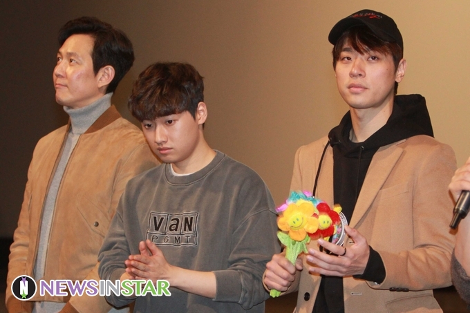 24일 오후 서울시 용산구 CGV 용산아이파크몰에서 영화 ‘사바하’ 무대인사 행사가 열려 배우 이정재, 박정민, 이다윗과 장재현 감독이 참석해 극장을 찾은 관객에게 인사하는 중 관객 100만 돌파 소식을 전하고 있다.