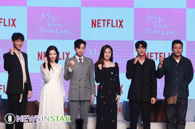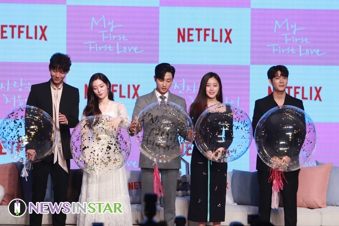 12일 오전 서울시 영등포구 여의도동 콘래드 서울에서 넷플릭스 오리지널 시리즈 '첫사랑은 처음이어서' 제작발표회가 열려 지수X정채연X진영X최리X강태오가 참석해 포토타임에 포즈를 취하고 있다.