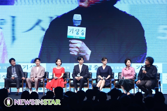 22일 오전 서울시 중구 소공동 웨스틴 조선호텔에서 영화 '기생충' 제작발표회가 열려 배우 송강호, 이선균, 조여정, 최우식, 박소담, 장혜진과 봉준호 감독이 참석해 봉준호 감독이 기생충 영화에 설명하고 있다. 여담으로 기생충은 한마리도 출연하지 않는다고 설명 하고 있다.