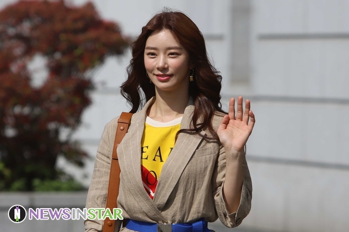 이날 이주빈이 출근길에 포즈를 취하고 있다.