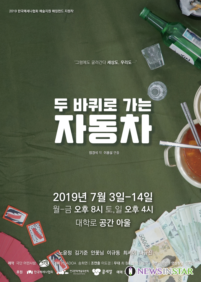 연극 <두 바퀴로 가는 자동차>는2019 한국메세나협회 예술지원 매칭펀드 지원작으로 선정된 작품이다. 가지각색의 등장인물 6명이 하우스에서 만들어내는 ‘웃픈’ 휴먼스토리를 선보인다. 연극계에서 활발하게 활동하는 극단 어떤사람과 극단 냇돌의 베테랑 배우들이 참여해 관객들의 기대를 한껏 모으고 있다.