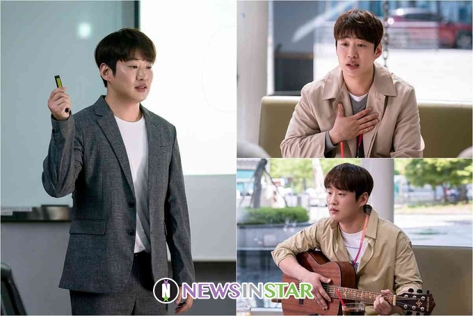 그의 설명처럼 오늘(6일) 공개된 스틸컷만 봐도 ‘범수’란 인물을 한마디로 정의하기 어렵다. 말끔하게 정장을 차려입고 프레젠테이션을 하는 범수는 프로페셔널해 보인다. 반면 방송국 로비에서 기타를 연주하는 범수는 뜬금없어 보인다. 감정이 널을 뛴다는 작가 진주만큼이나 종잡을 수 없는 인물로 추정되는 바. 맡은 역할마다 자신만의 색깔로 소화해내는 안재홍이 이번엔 어떤 캐릭터를 완성해낼지 궁금해진다.
