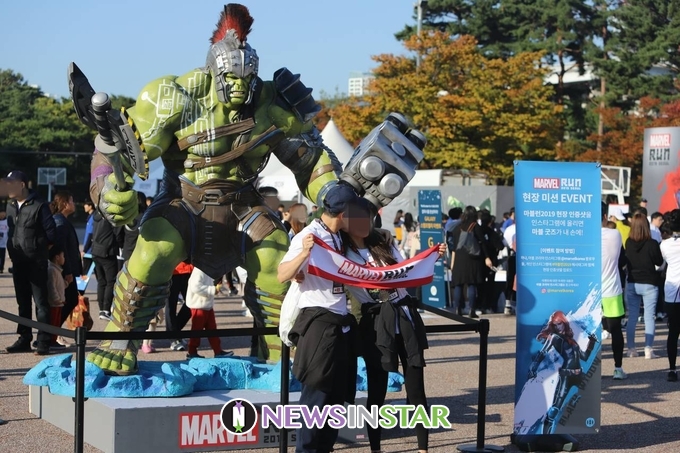 27일 오전 서울시 영등포구 여의도공원 문화의 마당에서 월트디즈니 컴퍼니 코리아의 마블 테마 러닝 행사인 '마블런 2019'가 열려 c참가자들이 마블 캐릭터와 함께 기념 촬영을 하고 있다.