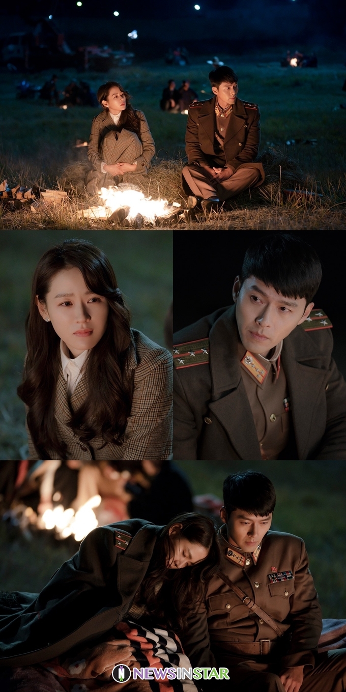 사진 속에는 타오르는 모닥불 앞에서 다정한 투샷을 보여주는 ‘둘리 커플(리정혁+윤세리)’의 모습이 담겼다. 어두운 밤하늘 아래 불빛을 의지하고 나란히 앉은 리정혁과 윤세리는 서로를 향해 애틋한 시선을 주고받고 있다. 과연 두 사람이 장교 사택 단지를 떠나 들판 위에 정처 없이 머무르게 된 이유가 무엇인지, 이들이 향하는 곳은 어디인지 호기심이 증폭된다.