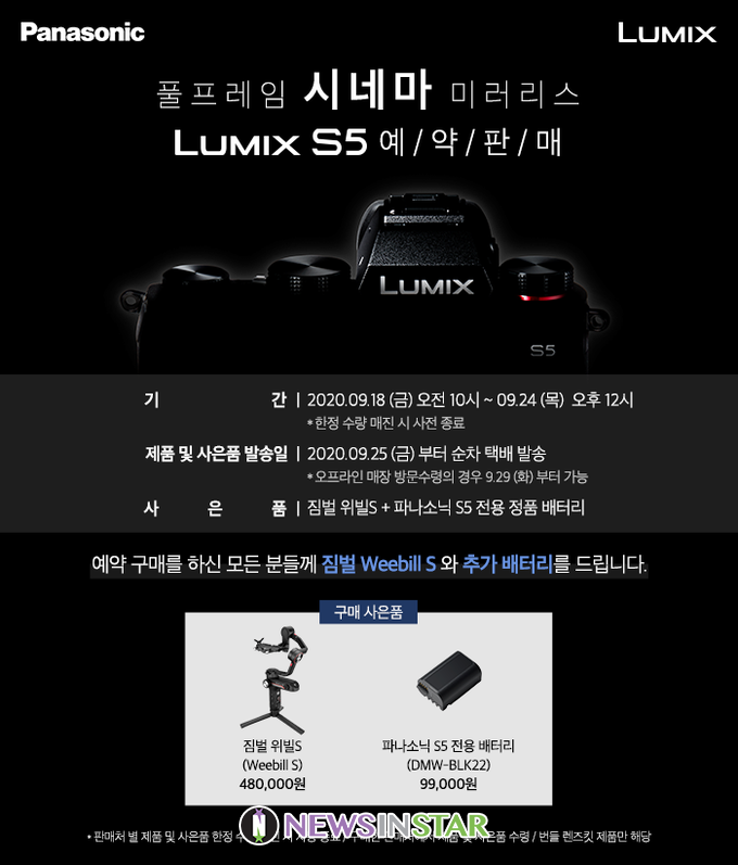 파나소닉코리아는 이번 예약판매를 통해 루믹스 S5 번들 렌즈킷을 구매하는 고객에게 짐벌 Weebill S(480,000원) 및 루믹스 S5 전용 추가배터리(99,000원) 두가지 모두 사은품으로 증정할 예정이다. 9월 18일 오전 10시부터 24일 오후 12시까지 신청할 수 있으며, 한정 수량 매진 시 사전에 종료된다.