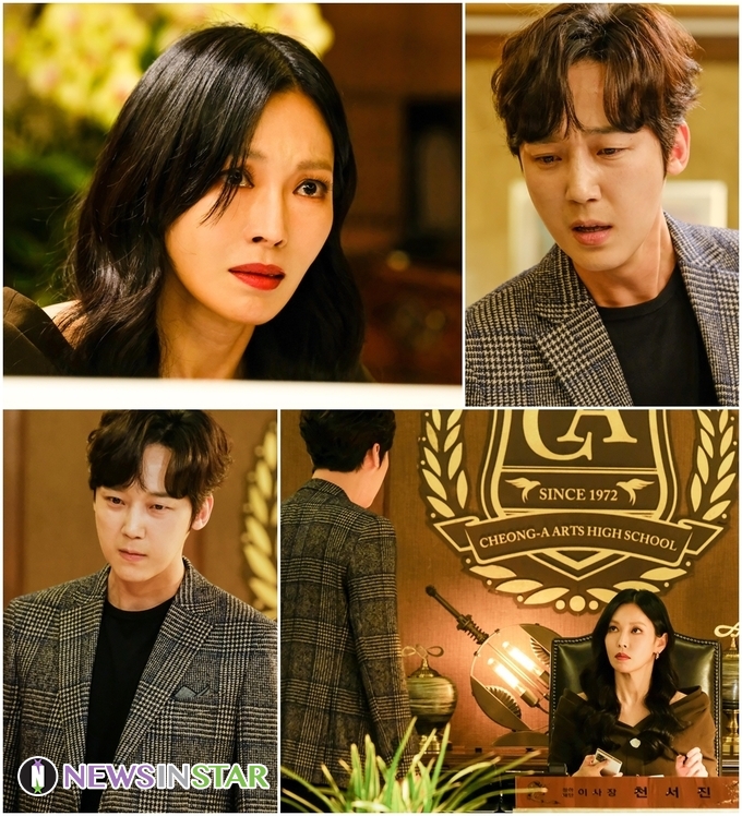 이와 관련 김소연과 윤종훈이 감정이 극도로 치달은 채 서로에게 시선을 고정하고 있는 ‘극강 눈빛 격돌’ 현장이 포착돼 시선을 집중시키고 있다. 극중 하윤철이 천서진의 이사장실을 찾아 마주하는 장면. 천서진은 애써 냉정한 표정을 지어 보이며 하윤철을 바라보지만, 하윤철은 천서진을 향해 화가 잔뜩 난 눈빛으로 분노를 터트려낸다. 더욱이 이내 끓어오르는 눈물을 머금은 두 사람이 참을 수 없다는 듯 감정을 폭발시키는 모습이 담기면서, 천하 부부에게 또 어떤 위기가 닥쳤을지 궁금증을 증폭시키고 있다.