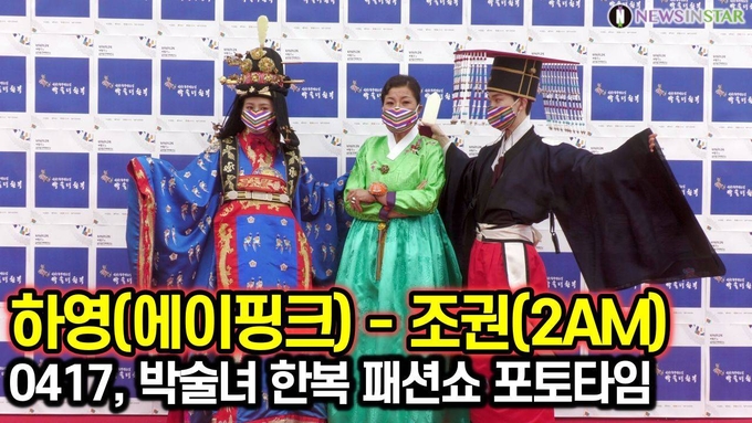[뉴스인스타 양철수기자] 4월 17일(토) 오후 경북 상주시 함창읍 한국한복진흥원 개원 기념 박술녀한복 패션쇼가 열려 에이핑크 하영과 2AM 조권이 포토타임에 포즈를 취하고 있다.