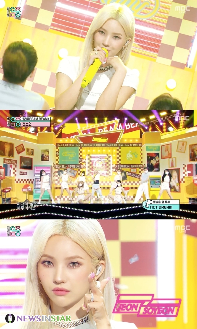 전소연은 오늘 (10일) 방송된 MBC '쇼! 음악중심'에서 미니 1집 'Windy'(윈디)의 타이틀곡 '삠삠'(BEAM BEAM) 무대를 선보였다.