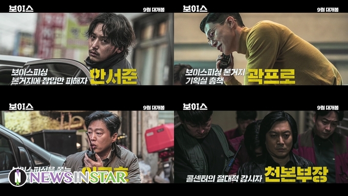 공개된 <보이스> 캐릭터 예고편은 대한민국 관객들이 사랑하는 대표 배우 변요한, 김무열, 김희원, 박명훈의 새로운 인생 캐릭터의 탄생을 엿볼 수 있어 기대를 모은다. 먼저 보이스피싱으로 모든 것을 잃고 본거지로 잠입하는 ‘한서준’(변요한)은 누구도 알지 못하는 보이스피싱 실체를 쫓는 절박함과 이들을 처리해나가는 통쾌한 액션으로 눈을 뗄 수 없게 만든다. 이어 보이스피싱 본거지의 총책 ‘곽프로’(김무열)는 “지옥 맛 좀 보여주자 오늘”이라는 대사로 범죄를 즐기는 듯한 잔혹한 모습을 보여주며 등장부터 강렬한 악역의 탄생을 예고한다. 지능범죄수사대 팀장 ‘이규호’(김희원)도 보이스피싱 범죄의 뿌리를 뽑기 위한 절실한 추격으로 극에 긴장감을 끌어갈 것으로 기대 된다. 마지막으로 보이스피싱 본거지의 절대적 감시자 ‘천본부장’(박명훈)까지 강렬한 비주얼로 등장해 영화에 대한 호기심을 더욱 증폭시킨다. 치밀하고 거대한 보이스피싱 실체를 쫓는 자들과 거대한 실체를 움직이는 자들의 맞대결을 리얼하고 스릴 넘치게 그려낼 영화 <보이스>는 새로운 범죄액션의 대표작 탄생을 예고하며 극장가 활기를 더할 예정이다.