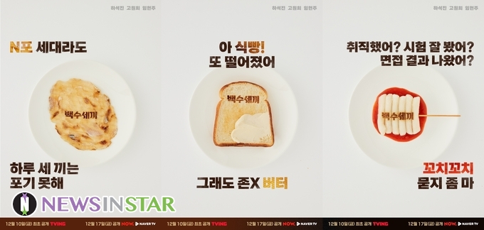 지난 24일 공개된 티저 포스터는 ‘백수세끼’만의 정체성을 확고히 드러낸다. 각기 다른 세 가지 음식으로 “N포 세대라도 하루 세 끼는 포기 못해”, “아 식빵! 또 떨어졌어. 그래도 존X버터”, “취직했어? 시험 잘 봤어? 면접 결과 나왔어? 꼬치꼬치 묻지 좀 마”라는 신박한 언어유희를 표현, 치열한 취업 전쟁에 뛰어든 취준생의 웃픈 심정을 대변한다. 그럼에도 삼시 세끼 잘 먹으면서 버텨내자는 게 ‘백수세끼’가 전하고자 하는 따뜻한 위로의 메시지다.