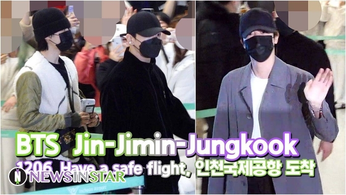 [뉴스인스타 양철수기자] 12월 6일(월) 오전, 인천시 중구 운서동 인천국제공항 제2터미널에 방탄소년단(BTS) 진, 지민, 정국이 미국 LA에서 진행된 'PERMISSION TO DANCE ON STAGE - LA' 공연을 마치고 입국하고 있다.