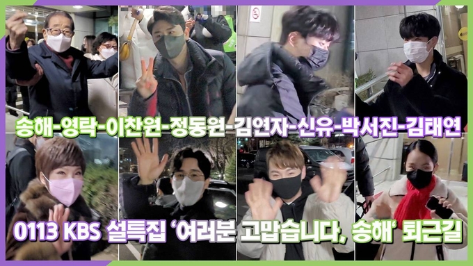 [뉴스인스타 양철수기자] 1월 13일(목) 오후, 서울시 영등포구 여의도 KBS 공개홀에서 진행된 KBS 설특집 '여러분 고맙습니다, 송해' 출연을 마치고 송해, 영탁, 이찬원, 정동원, 김연자, 신유, 박서진, 김태연이 방송국을 나서며 포즈를 취하고 있다.