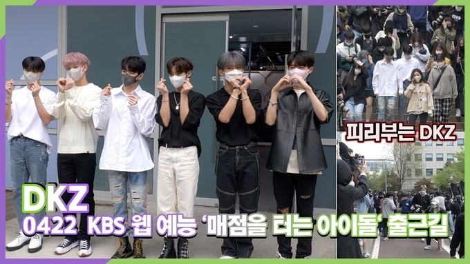 [뉴스인스타 양철수기자] 4월22일(금) 오후, 서울시 영등포구 여의도 KBS 누리동에서 진행되는 KBS 웹 예능 '매점을 터는 아이돌' 녹화를 위해 그룹 그룹 DKZ 경윤, 문익, 재찬, 종형, 세현, 민규, 기석이 방송국에 도착해 포즈를 취하고 있다.