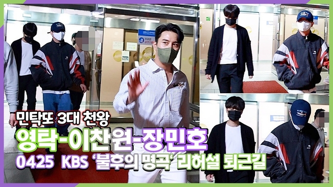 [뉴스인스타 양철수기자] 4월25일(월) 새벽 1시, 서울시 영등포구 여의도 KBS 공개홀에서 진행된 KBS 예능 '불후의 명곡' 어버이날 특집 3대 천왕 리허설을 마치고 영탁, 이찬원, 장민호가 방송국을 나서고 있다.