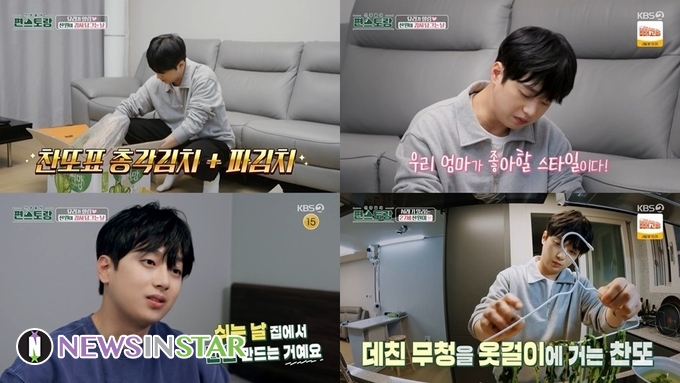 이어 이찬원은 거실에 신문을 깔고 본격적으로 총각김치, 파김치 만들었다. 재료를 다듬던 중 우리네 어머니가 떠오르는 자세로 앉아 ‘사랑과 전쟁’을 몰입해 지켜보는 이찬원의 모습은 웃음을 안겼다. 이후 이찬원은 김칫소를 만들 때 요구르트를 넣는 자신의 비법을 공개해 눈길을 끌기도.