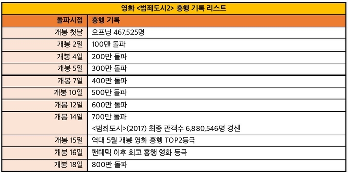영화 <범죄도시2>는 개봉 첫날 팬데믹 이후 한국 영화 최고 오프닝, 개봉 2일만 100만 돌파, 개봉 4일째 200만 돌파, 개봉 5일째 300만 돌파, 개봉 7일째 400만 돌파, 개봉 10일째 500만 돌파 및 개봉 11일만 2022년 올해 최고 흥행 영화 등극, 개봉 12일째 600만 관객 돌파, 개봉 14일째 전편 흥행 경신 및 700만 관객 돌파, 개봉 15일만에 역대 5월 개봉 영화 흥행 TOP2, 개봉 16일만에 팬데믹 최고 흥행작 등극, 개봉 18일째 800만 관객돌파까지 이어 가고 있다.