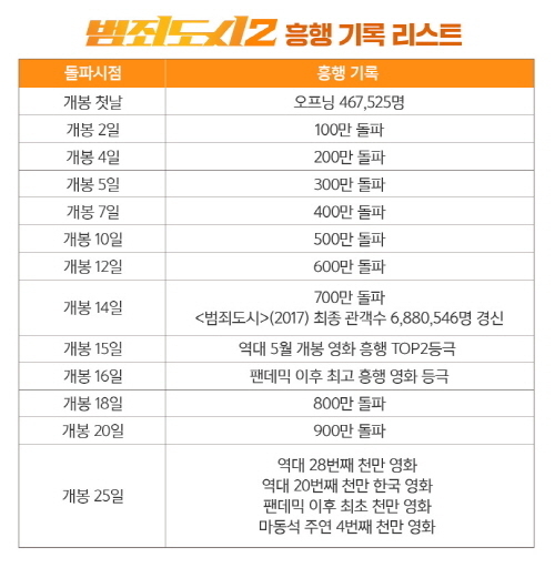 영화 <범죄도시2>는 개봉 첫날 팬데믹 이후 한국 영화 최고 오프닝, 개봉 2일 100만, 4일 200만, 5일 300만, 7일 400만, 10일 500만, 12일 600만, 14일 700만, 18일 800만, 20일 900만, 25일 1,000만 관객을 돌파했다. 조만간 <겨울왕국>(2014), <인터스텔라>(2014) 및 역대 5월 개봉 최고 흥행작 <기생충>(2019)의 기록도 뛰어넘을 것으로 예상된다.