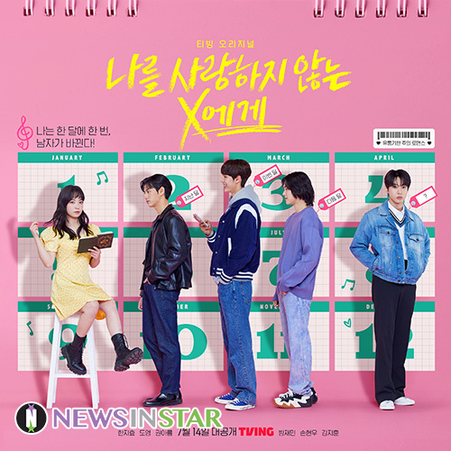 꿈과 사랑 속에서 고민하는 20대 청춘들의 이야기로 찾아올 티빙 오리지널 <나를 사랑하지 않는 X에게>는 한지효, 도영, 권아름, 방재민, 손현우, 김지훈 등이 출연하며, 오는 7월 14일(목) 오직 티빙에서 만날 수 있다.