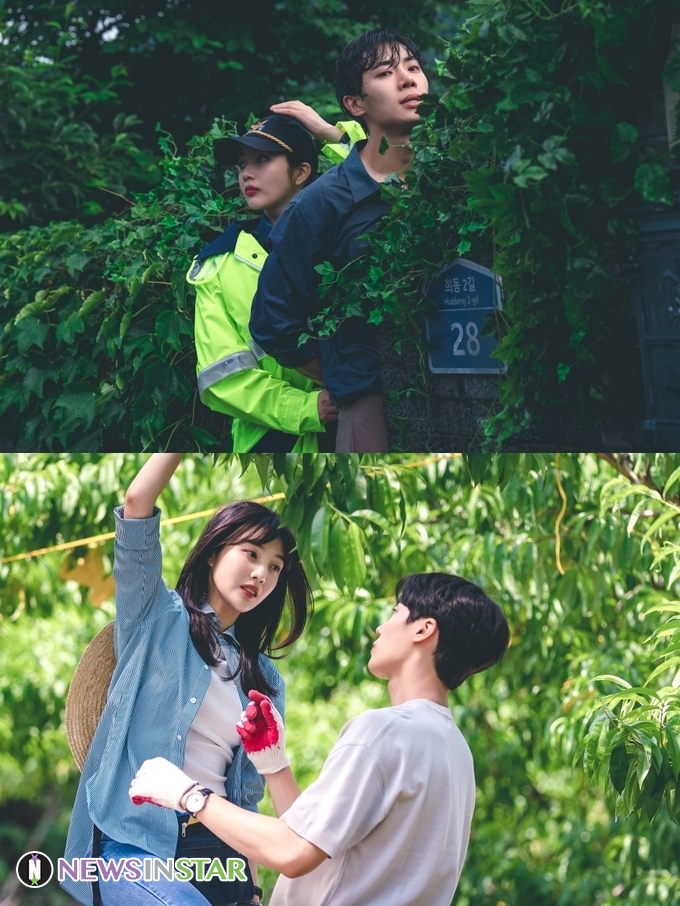 먼저 자칫 긴장감까지 느껴지는 수상한 스틸컷은 바로 자영과 지율의 유쾌하지 않은 첫 만남. 폭우가 쏟아지는 어느 날, ‘안 순경’ 자영이 지율의 팔을 뒤로 꺾고 체포(?)하는 순간이 포착됐다. 최근 하이라이트 영상(https://tv.kakao.com/channel/4026450/cliplink/431344047)을 통해 공개된 것으로, 어느 집 담장을 넘으려던 지율을 목격한 자영이 호루라기까지 불며 쫓아와 단숨에 그를 제압, 이들의 첫 만남이 이뤄졌다. 급기야 순찰차로 연행된 지율은 그때부터 ‘인간 민원센터’라 불리는 희동리의 ‘오지라퍼’ 자영이 “뭐 하는 사람일까?”라는 강한 의문을 갖기 시작할 예정.