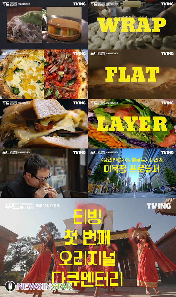 오리지널 다큐멘터리 <푸드 크로니클>(연출 이욱정/제공 티빙)은 <누들로드>와 <요리인류>로 이어져온 이욱정 PD의 음식에 대한 철학이 집대성된 작품으로, 요리의 역사를 인문학적으로 접근해 그 뿌리를 찾아가는 여정을 담았다. 인류가 문화 · 종교 · 인종 · 지리에 관계없이 ▲곡물 반죽에 고기와 채소를 싼 ‘랩(Wrap)’, ▲둥글고 납작한 원형의 음식 ‘플랫(Flat)’, ▲여러 가지 맛을 켜켜이 올려 하나의 형태로 쌓은 ‘레이어(Layer)’, 이 세가지 음식 형태를 선호하는 이유에 대해 디자인, 미학, 건축 등 다양한 관점에서 고찰할 예정이다.