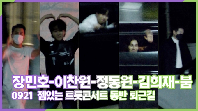 [뉴스인스타 양철수기자] 9월 21일(수) 오후, 서울 송파구 올림픽공원에서 열린 세라젬 젬있는 트롯콘서트를 마치고 트롯 가수 장민호 이찬원 정동원 김희재. 붐이 동반 퇴근하고 있다.