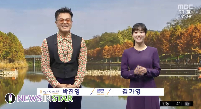김가영은 오늘(21일) 오전 생방송된 MBC ‘뉴스투데이’에서 스페셜 기상캐스터로 나선 가수 박진영과 함께 날씨를 전했다.