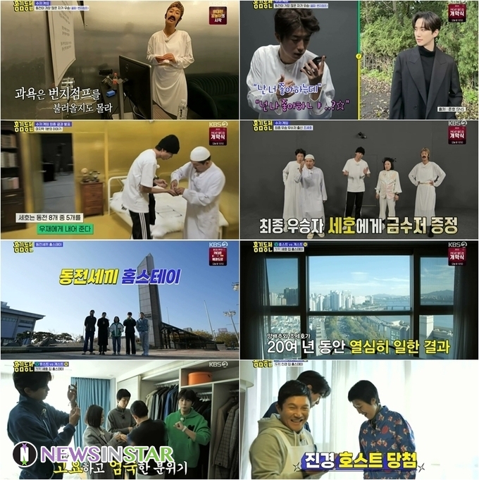 이어서 멤버들을 기다리고 있는 것은 ‘동전세끼 홈스테이’ 특집이었다. 동전을 던져 뒷면이 나오면 게스트, 앞면이 나오면 호스트가 되어 집으로 멤버들을 초대해야 하는 것. 평창동 홍진경과 김포 김숙이 모두 동전 뒷면이 나와 가슴을 쓸어내렸지만, 조세호가 앞면이 나와 첫 번째 호스트로 당첨됐다. 이에 멤버들은 조세호의 시계를 보러 갈 수 있다는 생각에 모두 들뜬 마음으로 조세호의 집으로 향했다. 조세호의 집은 한강이 한 눈에 들어오는 한강 뷰 아파트로 감탄을 자아냈다. 그러나 자가가 아닌 전세로 조세호는 “17억이 모자라서 집을 못 샀다”고 너스레를 떨어 멤버들의 웃음을 자아냈다.