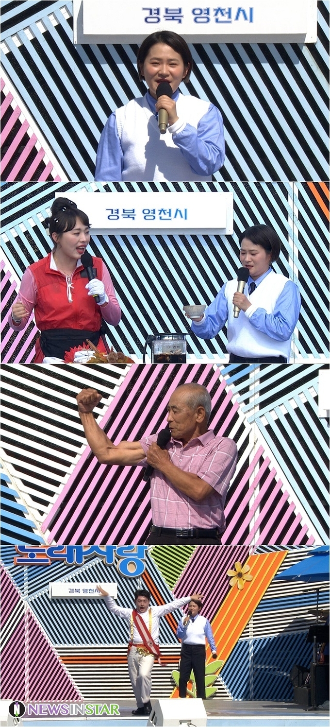 이번 ‘경북 영천시’ 편에는 올해 수능을 치른 고3 남학생부터 82세 몸짱 농부 할아버지, 24세의 모델아카데미 원장에 이르기까지 총 15팀이 본선 무대에 올라 흥과 끼가 넘치는 무대를 꾸몄다는 전언이다. 특히 이날 김신영은 자신의 부캐 ‘다비이모’로 변신해 ‘주라주라’를 열창한 ‘영천 다비이모’와 조우해 도플갱어 케미를 뽐내기도 했다는 후문.