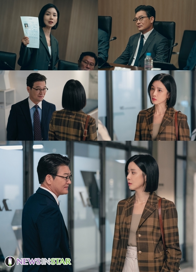 지독하게 앞만 보고 달리며 날카롭게 사안의 정곡을 찌르는 수로 PT 불패 신화를 만들어온 실력파 고아인과 속에 능구렁이 아흔아홉 마리를 감추고도 신사 같은 미소를 띄울 수 있는 사내 정치력으로 더 높은 자리를 바라보는 최창수. 두 사람의 대립이 만들어내는 쫄깃한 긴장감은 오늘(13일) 공개된 스틸컷에서도 여실히 느껴진다. 고아인의 우아한 여유와 냉철한 미소를 관록으로 맞받아치는 최창수 사이엔 당장이라도 불꽃이 타오를 것만 같다. 눈빛과 몸의 언어만으로도 이 모든 상황을 말해 줄 수 있는 ‘믿보’ 배우 이보영과 조성하의 연기력은 보면 볼수록 기대를 차오르게 한다.