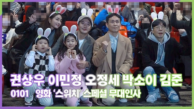 [뉴스인스타 양철수기자] 1월 1일(일) 오후, 서울시 송파구 롯데시네마 월드타워에서 영화 '스위치' 스페셜 무대인사 행사가 열려 배우 권상우, 이민정, 오정세, 아역배우 박소이, 김준이 참석해 관객들에게 감사 인사를 전하고 있다.