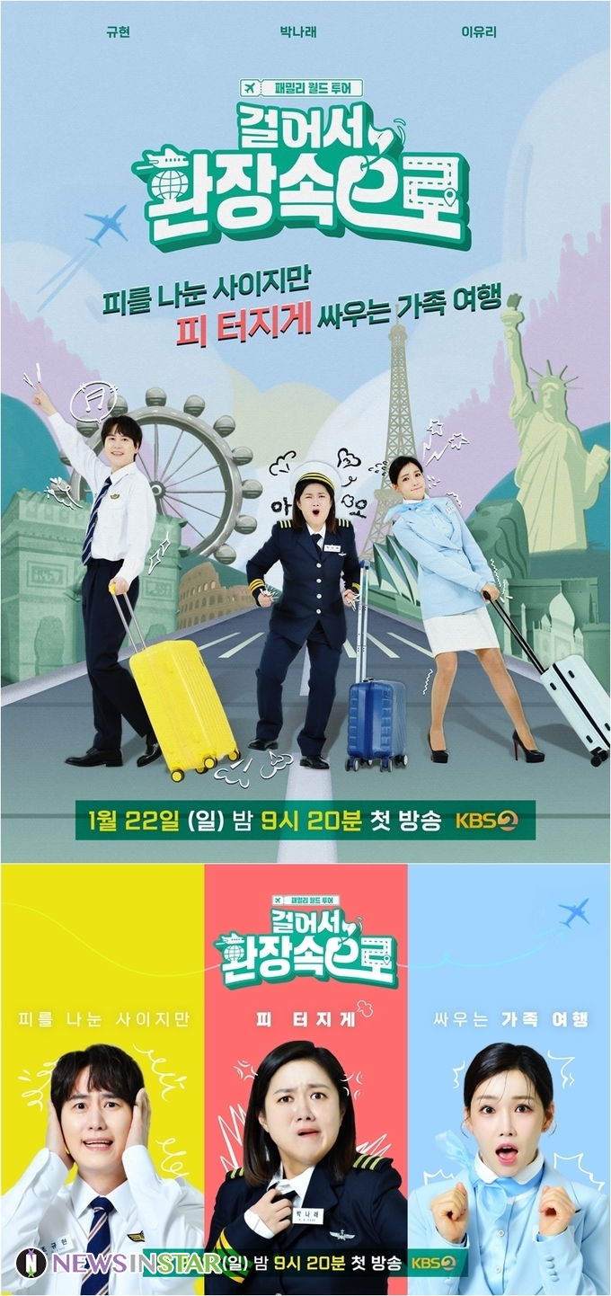 박나래, 이유리, 규현이 진행하는 KBS 2TV 신규 예능 '걸어서 환장 속으로'(연출 김성민, 윤병일, 이하 ‘걸환장’)는 여러 사연을 지닌 스타 가족의 드라마틱한 여행 버라이어티로 여행을 떠나는 가족들이 짐을 싸는 순간부터 집으로 귀환하는 순간까지 바람 잘 날 없는 예측 불허의 가족 여행기가 펼쳐진다. 그런 가운데 ‘걸환장’의 3MC, 박나래-이유리-규현의 제복 입은 단체 포스터와 3인 3색 위트 있는 포스터가 공개돼 눈길을 사로잡는다.