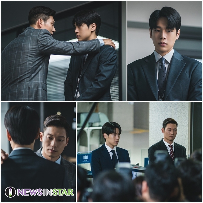 이와 관련 강유석이 박훈의 은밀한 회유에 이어 수상한 부름에 응답하더니, 급기야 같은 편이 된 듯한 모습으로 스토리 변주를 예고한다. 극중 장태춘이 결계와도 같던 황기석의 특수부 사무실에 들어간 장면. 황기석은 장태춘이 입장하자마자 날카로운 눈빛을 번뜩이고, 뚜벅뚜벅 다가가 어깨에 두 손을 턱 올린다. 까마득한 선배의 예상 밖 공격적인 태도에 장태춘이 순간 얼어붙은 가운데, 황기석이 장태춘을 바라보며 마치 경고를 전하듯 매서운 눈빛을 빛내 긴장감을 높인다.